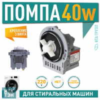 Сливной насос мощностью 40Вт обеспечивает эффективный отвод использованной воды после каждого цикла стирки. Устройство надежно фиксируется с помощью трех винтов. Подключение 2 контакта, сзади, раздельно. Помпа предназначена для отведения воды из стиральной машины. Рабочее напряжение 220В позволяет использовать в бытовых условиях.