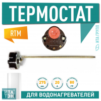 Стержневой регулируемый термостат наиболее распространённый вид терморегулятора. Поддерживает температуру в нужном интервале в автоматическом режиме. По достижении максимальной температуры в термостате срабатывает реле, которое отключает нагрев ТЭНа и автоматически включает его при понижении температуры по достижении нижней границы температурного диапазона. Термостат серии RTM предназначен для контроля температуры воды в водонагревателе, и его рабочий режим составляет от 25 до 80º. Использовать термостат возможно в сетях переменного тока до 250В.